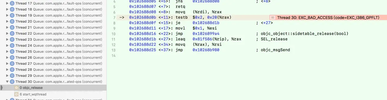 执行100000次(emm...由于对象指针的大小只有8个字节(64位),出问题的概率比较小),出现了野指针:
