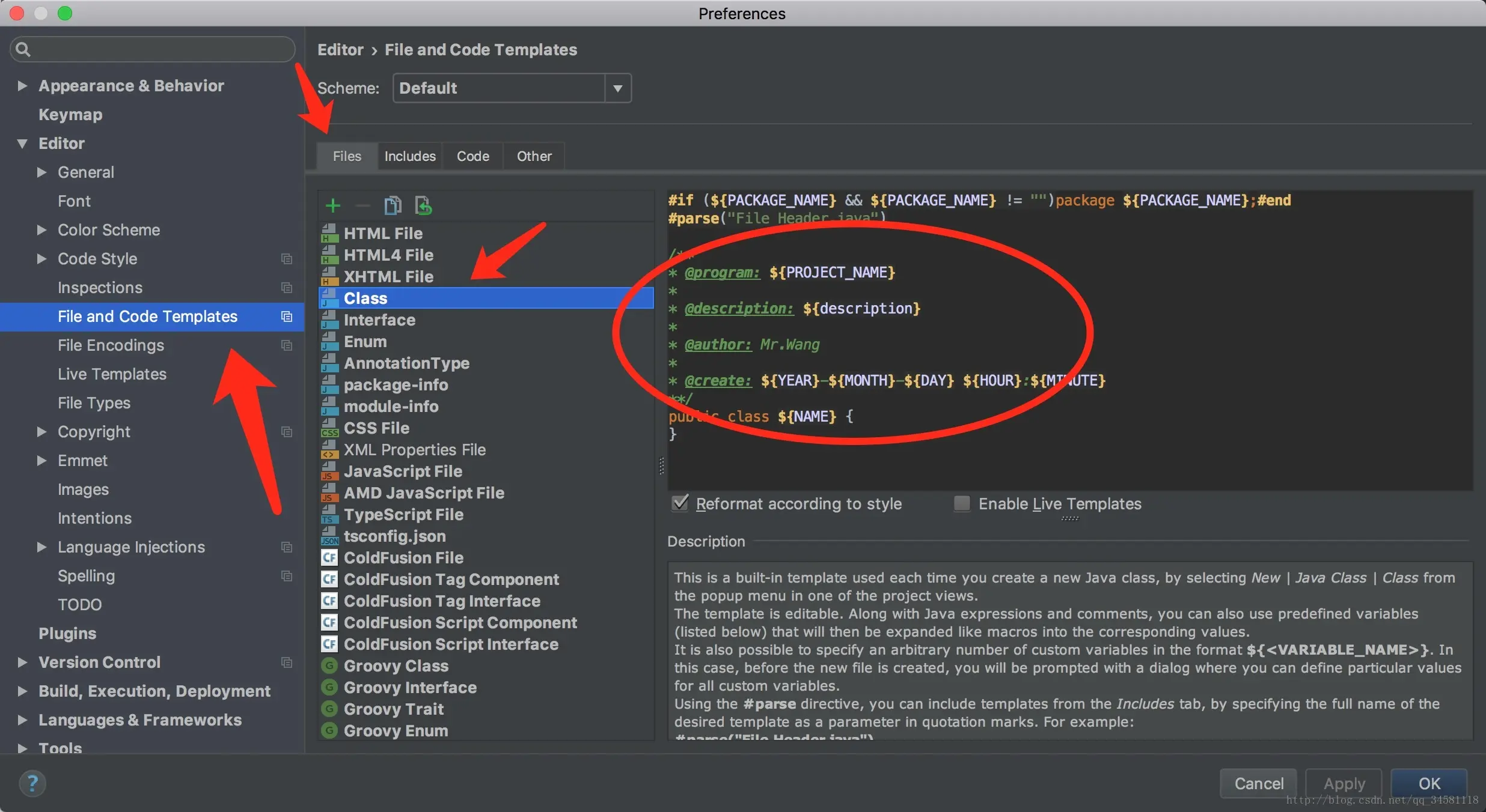 打开Preferences-> Editor -> File and Code Templates -> Files -> Class