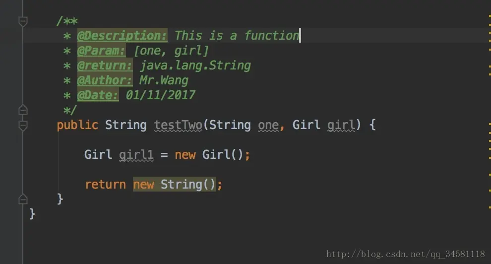 打开Preferences-> Editor -> Live Templates -> 点击右边加号为自己添加一个Templates Group -> 然后选中自己的Group再次点击加号添加Live Templates 然后设置自己喜欢的快捷键 在Abbreviation里面 记得在Applicable in 里面勾选,起码也要勾选class 然后在Edit variables里面添加参数和返回值的自动取值 然后再你的方法上面直接输入/ + 你设置的Abbreviation快捷键 + tab键就直接生成了 (我设置的是/+ a + tab) 效果图: