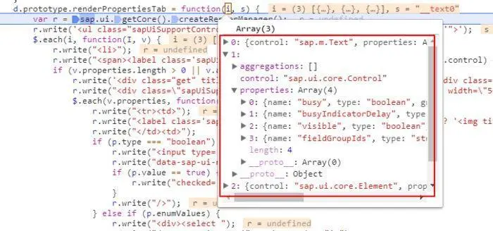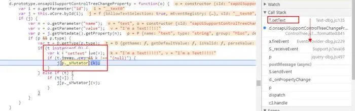 我们在属性列表当中可以直接去实时地修改某一项属性,这又是如何做到的呢?想来这个过程最终一定是调用到了控件本身的set方法,我们就在sap.m.Text的setText方法中打一个断点,然后在调用栈中向上追溯,发现了目标方法onsapUiSupportControlTreeChangeProperty。原来是在控件的Metadata中存有各个属性所对应的Set方法的名称,在通过简单的校验之后用户所输入的值就通过setText方法被赋值进去了。