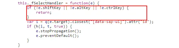 这里我们可以看到当UI5诊断工具处于打开状态时,mousedown事件的处理方法会增加一个,便是Selector的_fSelectHandler方法。而在这里将会判断如果三个修饰键同时被按下,则帮助用户在Control Tree中选中相应的元素节点。