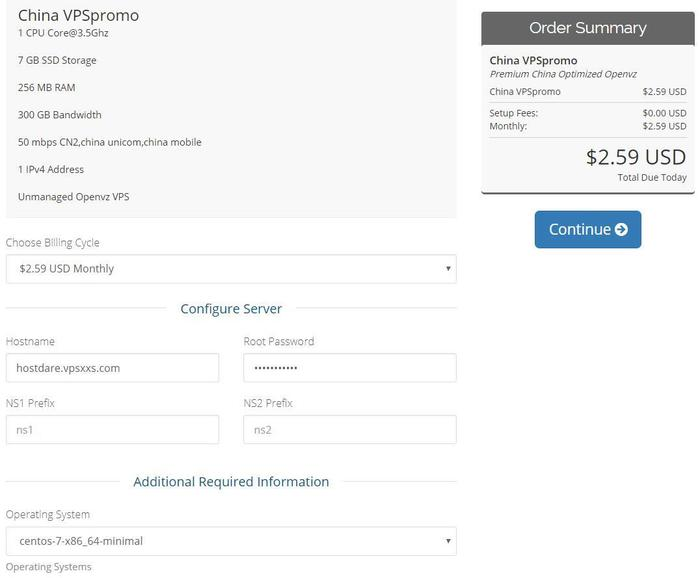 在Choose Billing Cycle中选择Annually才是年付,年付才能使用优惠码,VPS小学生因为吃灰小鸡太多,这里就只月付给大家做测评演示了。hostname给自己主机起个名字,其他的照样填写,点击Continue