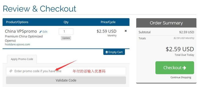 接下来输入hostdare优惠码U58TF02MIG,然后点击Validate Code就会显示优惠后的价格,然后点击Checkout进入下一步