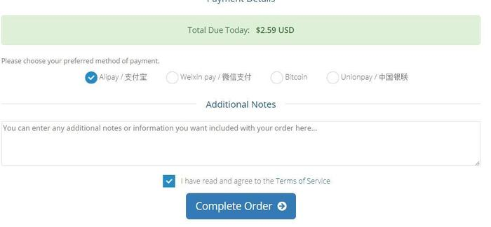 接下来直接付款即可。VPS小学生用的微信支付,因为还没用过其他商家的微信支付就试试好用不好用,挺方便的,扫二维码直接支付了,还可以使用自己微信绑定的信用卡。