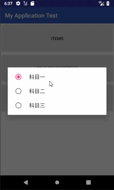 .setSingleChoiceItems(new String[]{"科目一", "科目二", "科目三"}, 0, new DialogInterface.OnClickListener() {