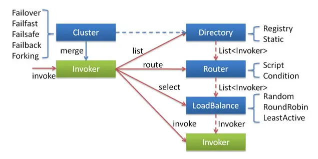 另外,在官方《Dubbo 用户指南》集群容错部分,给出了调用的各功能组件关系图: