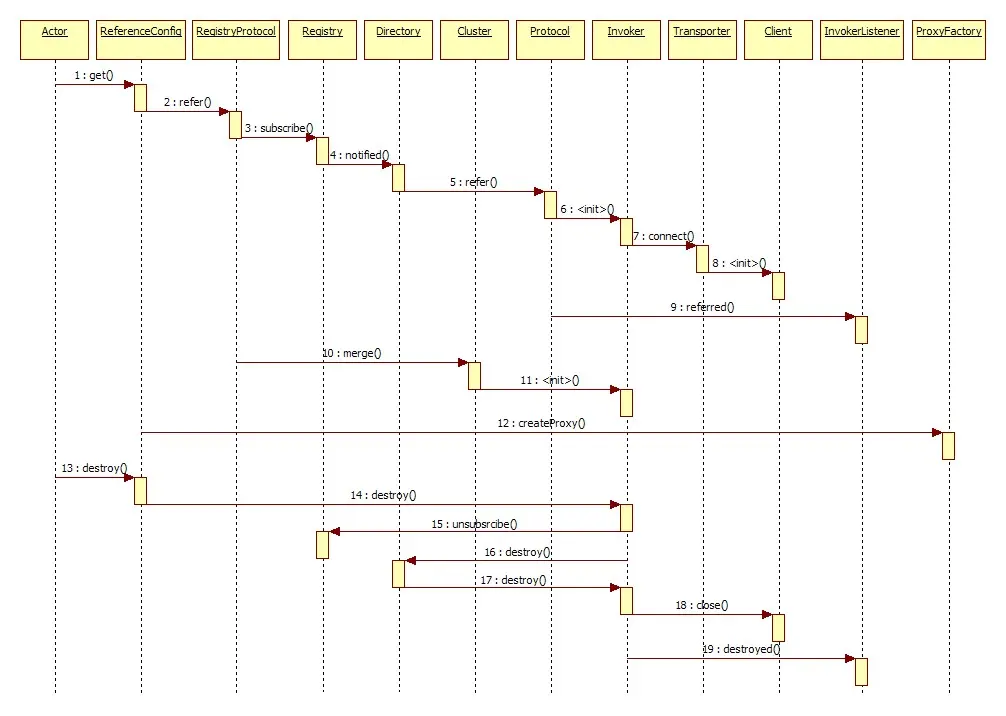 在官方《Dubbo 开发指南》框架设计部分,给出了引用服务时序图: