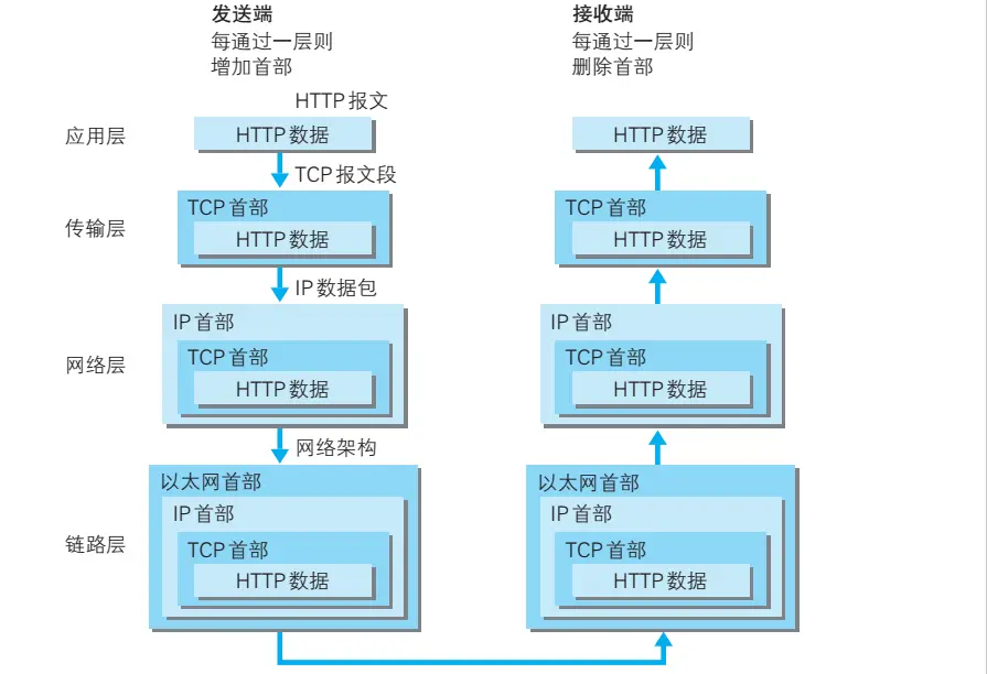 利用TCP/IP协议进行网络通信的时候,客户端从应用层往下走,服务器则从链路层想向上走,传输顺序:客户端应用层->传输层->网络层—>链路层->服务器链路层->网络层->传输层->应用层