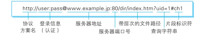 协议类型:[//登录信息@服务器地址[:端口号]][/资源层级UNIX文件路径]文件名[?查询][#片段ID]