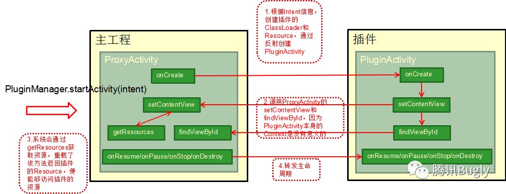 ProxyActivity中需要重写getResouces,getAssets,getClassLoader方法返回插件的相应对象。生命周期函数以及和用户交互相关函数,如onResume,onStop,onBackPressedon,KeyUponWindow,FocusChanged等需要转发给插件。