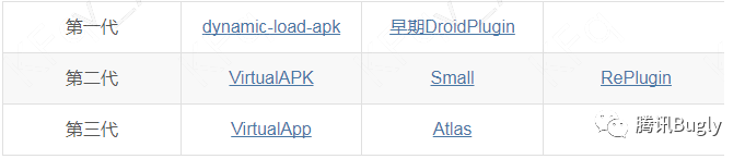 下面是比较出名的几个开源的插件化框架,按照出现的时间排序。研究它们的实现原理,可以大致看出插件化技术的发展,根据实现原理我把这几个框架划分成了三代。