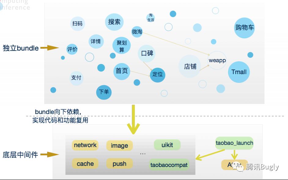 其中的独立bundle即是一个插件,手淘中的首页,详情页,扫码,支付等都做成了单独的bundle,并且首页bundle还可以依赖于定位bundle。而主工程中则包含了各种基础功能库供各个bundle调用,并且包含了对bundle的安装,运行,版本管理,安全校验等运行期的管理工作。