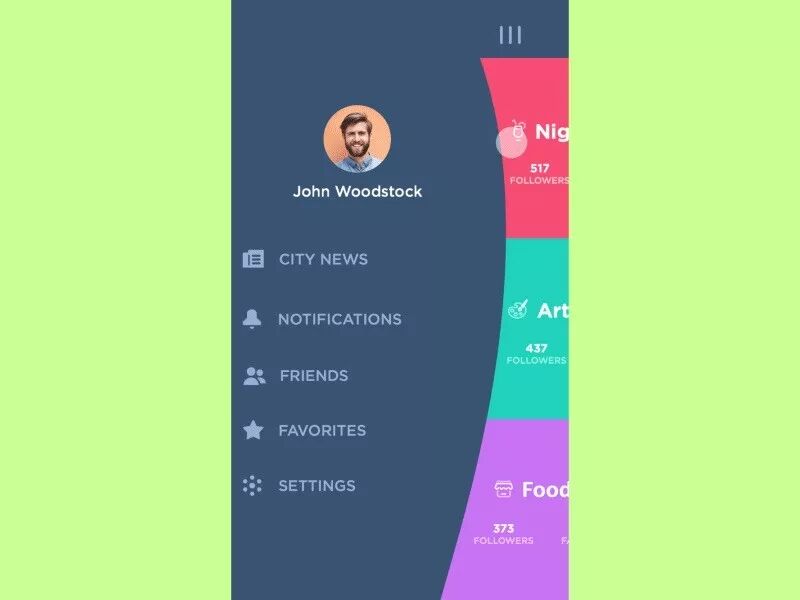 在这个侧拉式菜单的交互中, 动效不仅增加了乐趣,更加强了视觉层级的展示