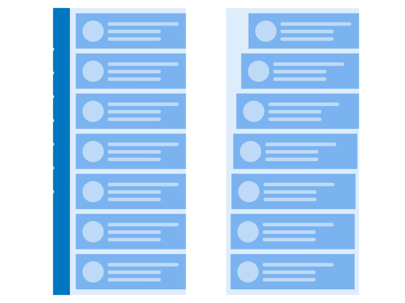 第一个例子展示了列表的交互:左边的动画只是将所有的列表整体上移,右边的动画则是在小卡片上添加了拖拽的效果。显然右侧的动画看起来更生动活泼,为滚动过程增添了一些乐趣。更有趣的是,右侧的概念性动画使卡片之间产生了一种存在更宽间距的视觉幻觉,这使界面中看上去有更多的留白。