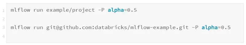 项目可以通过 Conda 来指定依赖关系。一个项目可能包含多个带有命名参数的运行入口。用户可以使用 mlflow run 命令行工具来运行项目,项目代码可以在本地,也可以在 Git 仓库里: