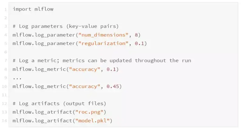 MLflow 的跟踪组件提供了一组 API 和用户界面,用于在运行机器学习代码时记录参数、代码版本、度量指标和输出文件,以便在后续进行可视化。通过几行简单的代码就可以跟踪参数、度量指标和文件: