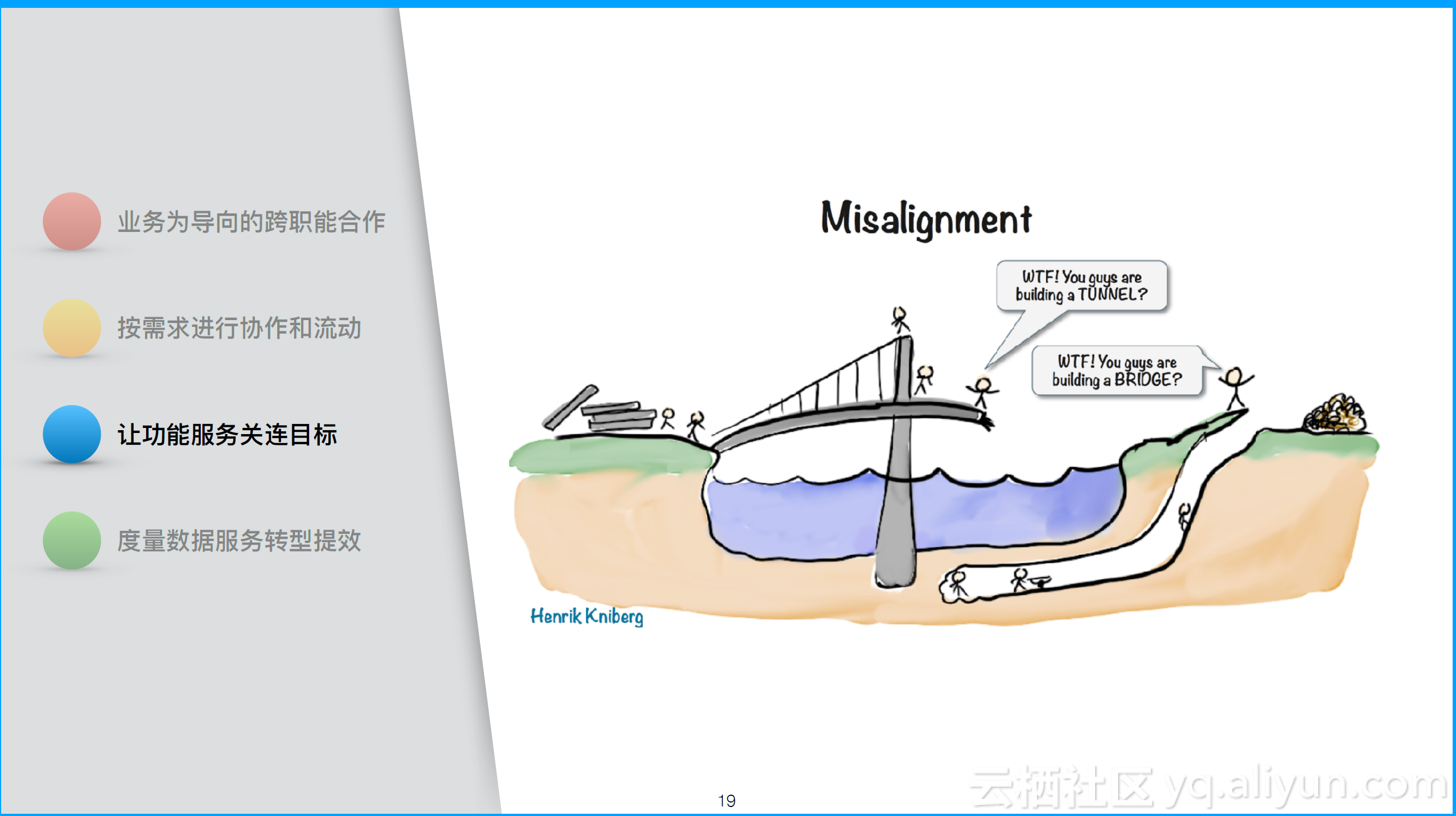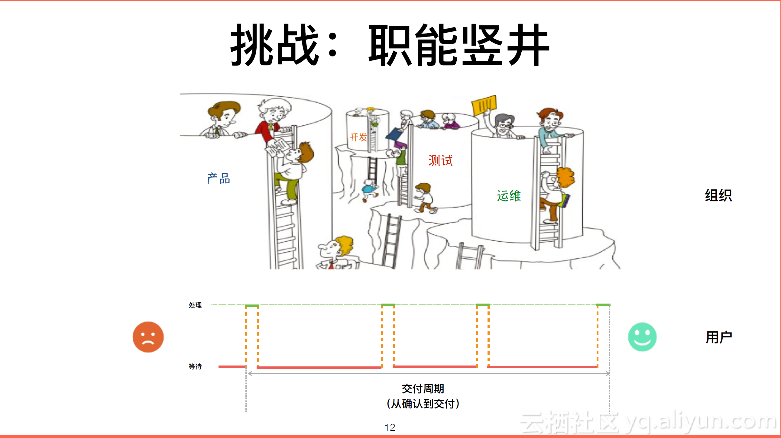 在互联网开发过程中,常常会发生一些让人苦笑不得的事情:例如我产品设计已经设计好了,剩下的就交给你们了,或是我代码已经全部编写,剩下的就交给你你们了等等。这种就是我们在软件开发过程中各种职能竖井的协作方式。在传统的软件开发过程中,经常是以职能为单位进行相互协作。