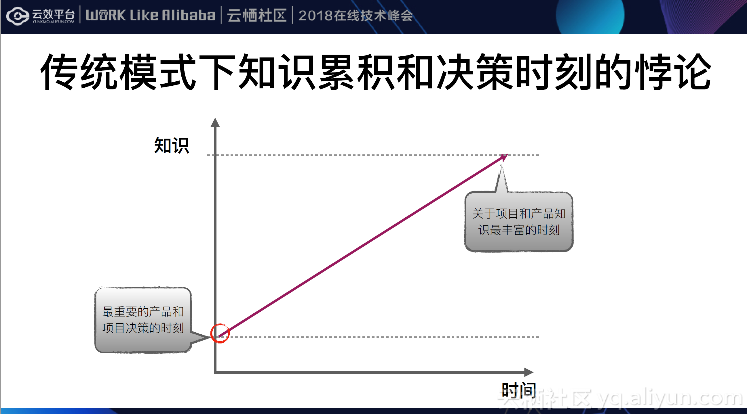 然而,在绝大多数软件开发过程中,传统的软件开发策略采用的是瀑布式开发方式,尤其是一些传统型企业,通常会保留几个月去做需求分析,再花费几个月的时间去做设计、开发、测试,到最终发布,整体周期可能很长。而最早决定做什么是在产品的需求分析阶段,也就是在产品项目知识最缺乏的时候进行的决定,这就是一个悖论,即在知识积累最少时,为产品的未来做来决定,决定产品的未来发展方向。