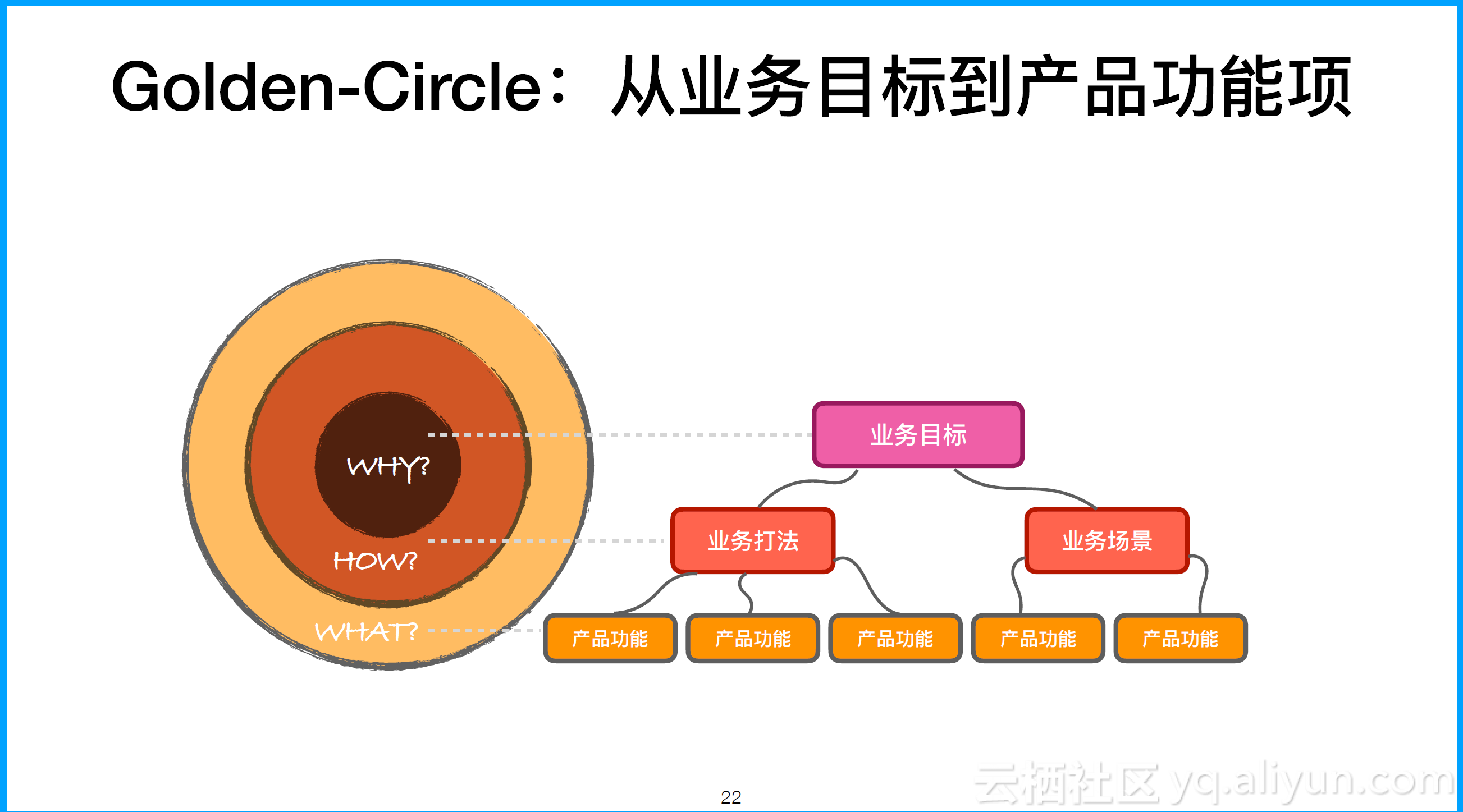 我们可以通过黄金圈法则的方法表示从业务目标到产品功能项。如图所示,在黄金圈的最内层是Why,中间层是How,最外层是What。其中Why表示业务目标,How表示的是业务打法或业务场景;What表示产品功能。通过Why、How、What的方式进行梳理,我们可以确定所开发的产品功能的业务目标,也能够很好确定功能需求的开发顺序。