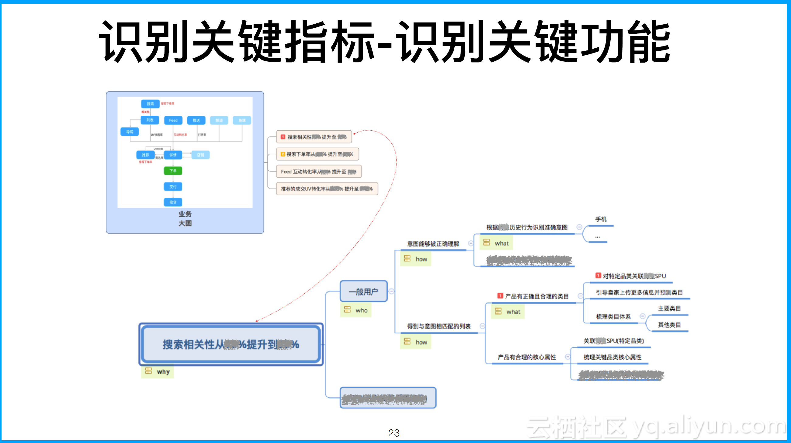 上图是根据黄金圈规则制定的具体案例。从业务大图中确定产品路径,在产品路径中根据业务目标分解成若干个关键指标,识别关键功能,要实现比如搜索相关性提高多少倍等关键指标,针对不同的方式,采用的方式也不尽相同,这里分别列出来Why、How和What。这一路径图通常贴在价值板的旁边,定期组织业务团队同步目前所处的业务目标、打法和功能,实现团队的对齐。