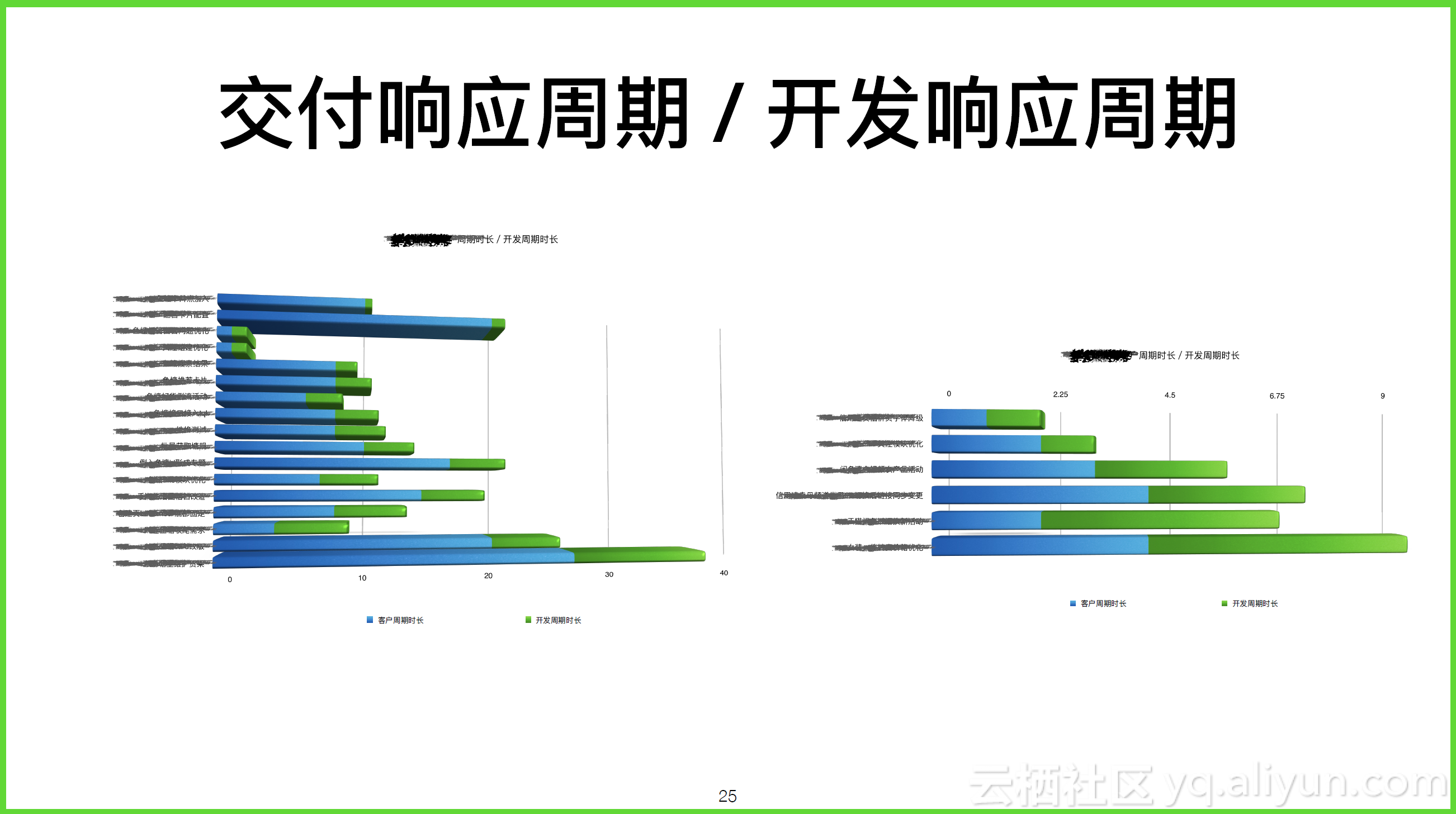 回到交付响应周期/开发响应周期上来,通过需求在不同阶段的流动过程,很容易确定需求的前置时间、在某个阶段的耗时。上图左侧显示的是需求占用的时间较长(蓝色表示需求时间、绿色表示开发时间),而右侧图需求阶段和开发阶段是1:1的关系,那么我们就需要思考为什么在需求侧耗时这么久。