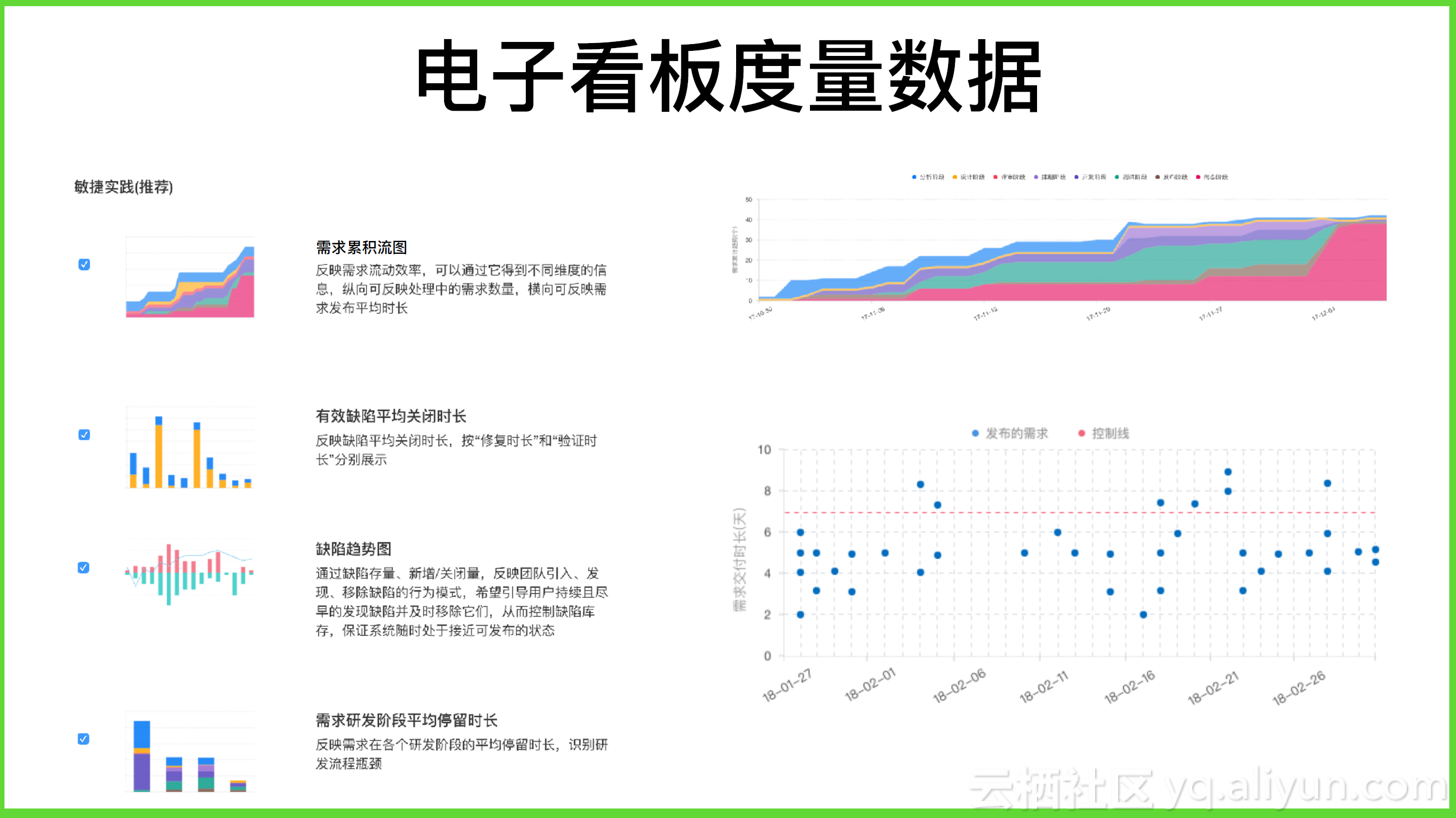 好的度量一是应该简单,不复杂;第二好的度量应该表达是一个完整“故事”,而非某个信息点;第三好的度量应该能够触发一个行动。正如需求在电子看板中呈现,在云效中,也可以将度量数据可视化,如上图所示,可以展示需求累积流图、有效缺陷平均关闭时长、缺陷趋势图、需求研发阶段平均停留时长等数据,通过这些数据能够帮助我们在研发效能进行改进。