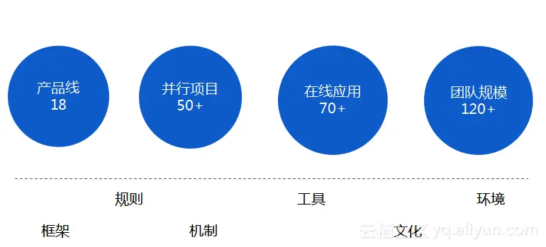 我们目前共支持18个产品线,最高的时候可以并行研发50多个项目,同时在线运维70多个应用,目前的研发团队规模是120多人,