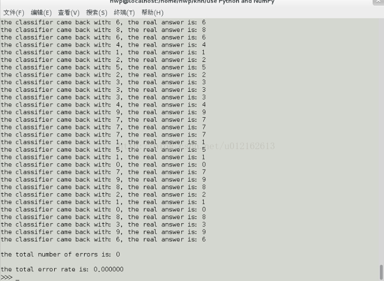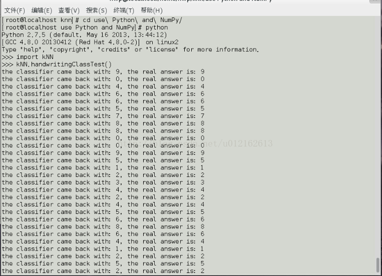 进入use Python and NumPy目录,打开python开发环境,import kNN模块,调用手写识别函数: