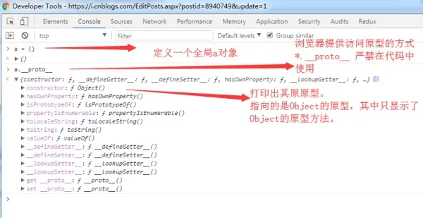 - 在此普及一个常识。所有的对象类的底层原型链最终会指向浏览器原生Object的原型。因此所以对象类均可调用Object的原型方法。以下贴图举个例子