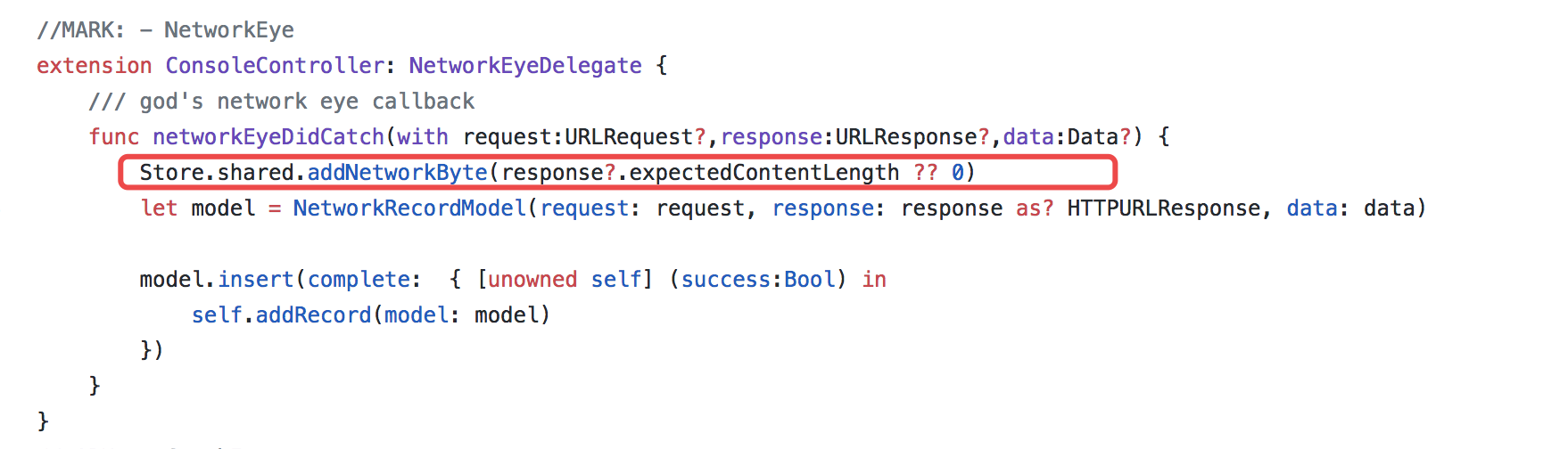 在 connectionDidFinishLoading 中记录了整个网络请求结束的时间、 response 数据大小、request 数据大小以及一些其他数据。