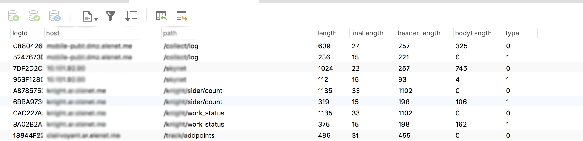 - 数据归类:按照 host 和 path 归类,一条记录记载改 host/path 的 Request 记录数,Response 记录数,Reqeust 总流量(上行流量),Reponse 总流量(下行流量)