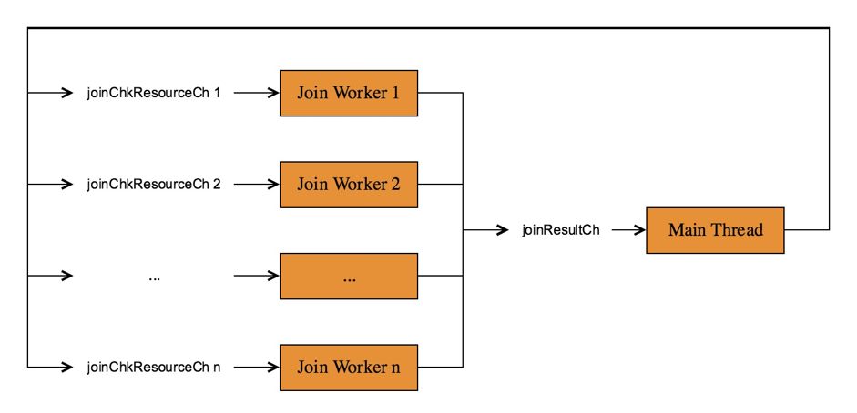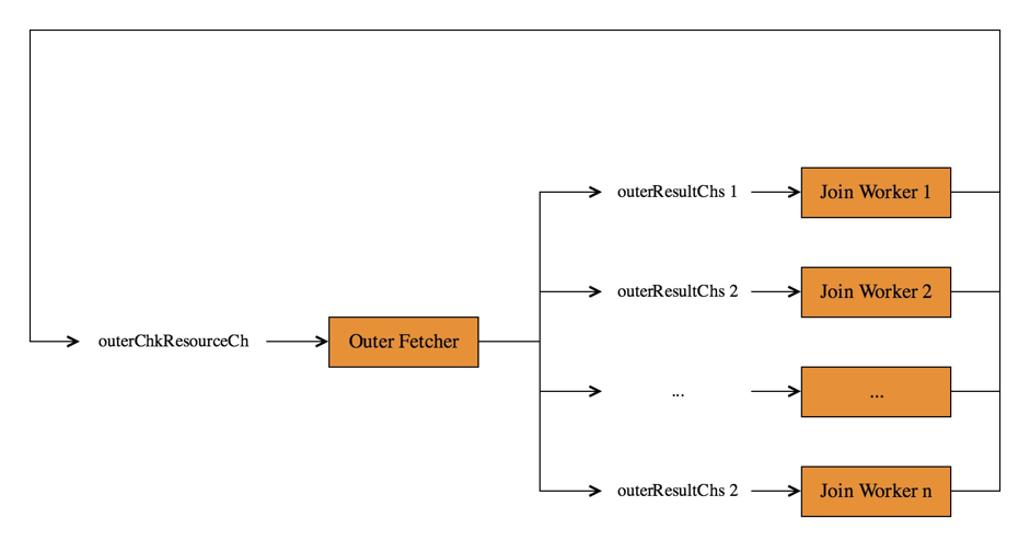 outerResultChs[i]:每个 Join Worker 一个,Outer Fetcher 将获取到的 Outer Chunk 写入到这个 channel 中供相应的 Join Worker 使用;