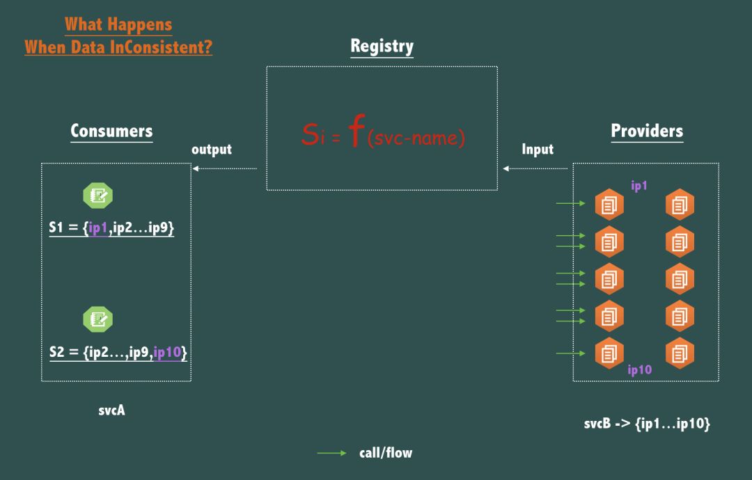 svcB 部署了 10 个节点 (副本 /Replica),如果对于同一个服务名 svcB, 调用者 svcA 的 2 个节点的 2 次查询返回了不一致的数据,例如: S1 = { ip1,ip2,ip3...,ip9 }, S2 = { ip2,ip3,....ip10 }, 那么这次不一致带来的影响是什么?相信你一定已经看出来了,svcB 的各个节点流量会有一点不均衡。