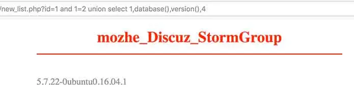 页面返回描述:在原来的标题上位置显示为mozhe_Discuz_StormGroup,内容的位置显示为5.7.22-0ubuntu0.16.04.1