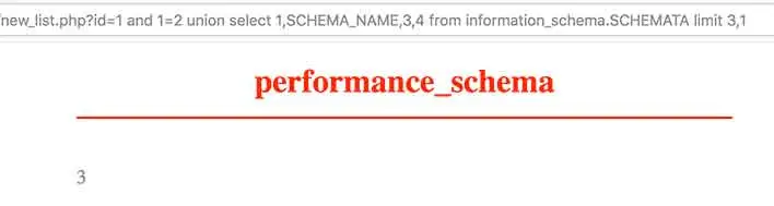 分析解说:limit 3,1意思是从第3行起,取1行数据,performance_schema为获取的第4个数据库名称。