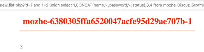 分析解说:查询数据库mozhe_Discuz_StormGroup的表StormGroup_member中的第2条数据的name、password、status的内容,三者之间用-连接起来,CONCAT的是把产生的字符串连接起来,这个地方拼接在一起时为了在一个地方全部显示出来。可以获得第一条数据的name账户为mozhe,密码password为6380305ffa6520047acfe95d29ae707b(md5加密后的密码,可通过解密获到明文),status账户状态为1。