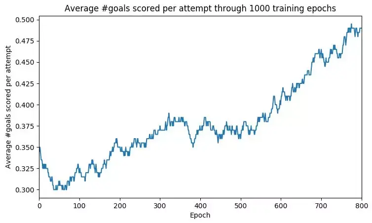 如上图所示,在训练 1000 个 epoch 后,平均射门得分率从 30% 上升到 50%。这意味着当前