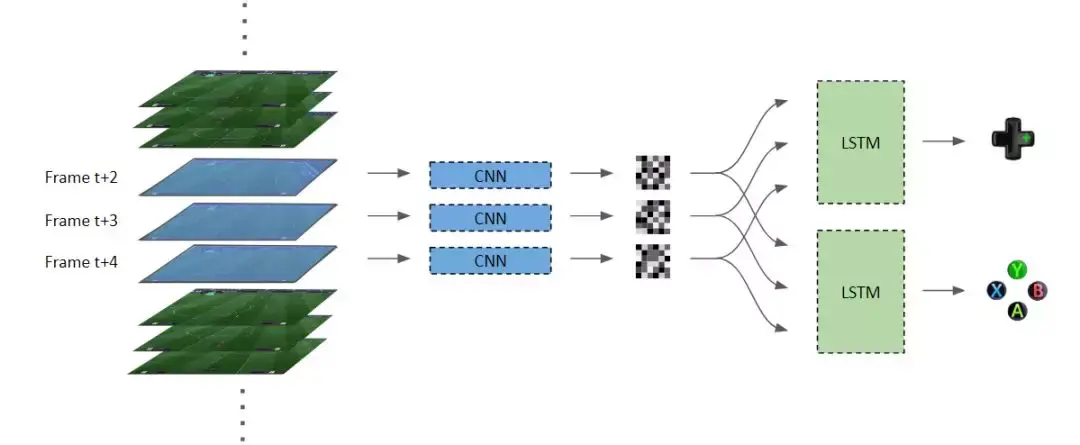 现在理解了图像之后,我们继续来决定下一步的行动。然而,我们并不想仅看完一个帧的图像就采取动作。我们首先需要观察这些图像的短序列。这正是 LSTM 发挥作用的地方,LSTM 就是因其对时序数据的优越建模能力而出名的。连续的图像帧在序列中作为时间步,每个帧使用 CNN 模型来提取特征图。然后这些特征图被同时馈送到两个 LSTM 网络。