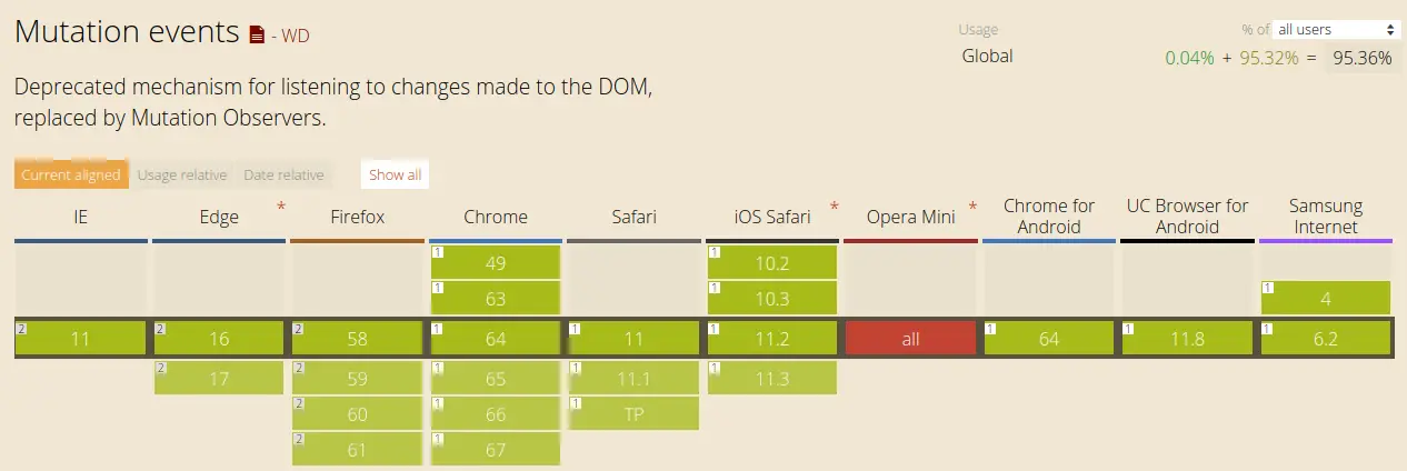 早在 2000 年,就推出了 MutationEvents API 。虽然挺管用的,但是每个单一的 DOM 变化都会触发 mutation 事件,结果又会造成性能问题。现在,MutationEvents 接口已经被废弃,不久的将来,现代浏览器全都将停止支持该接口。