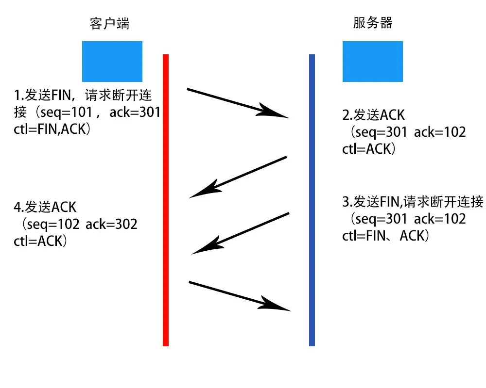 - 服务器接收到这个断连请求后,发送序列号为301、确认号为102的确认数据段,执行被动关闭。这时,完成了客户端→服务器的半关闭。