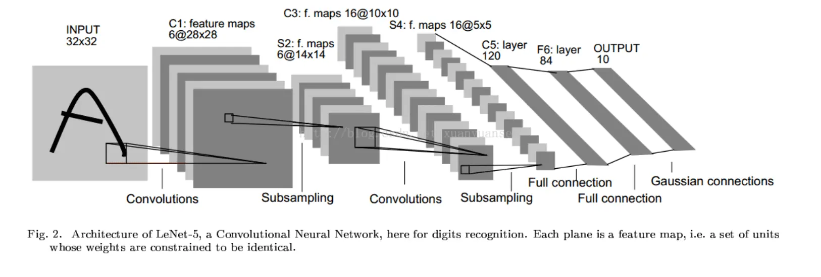 - 分类器使用了Gaussian Connections,目前已经被softmax替代