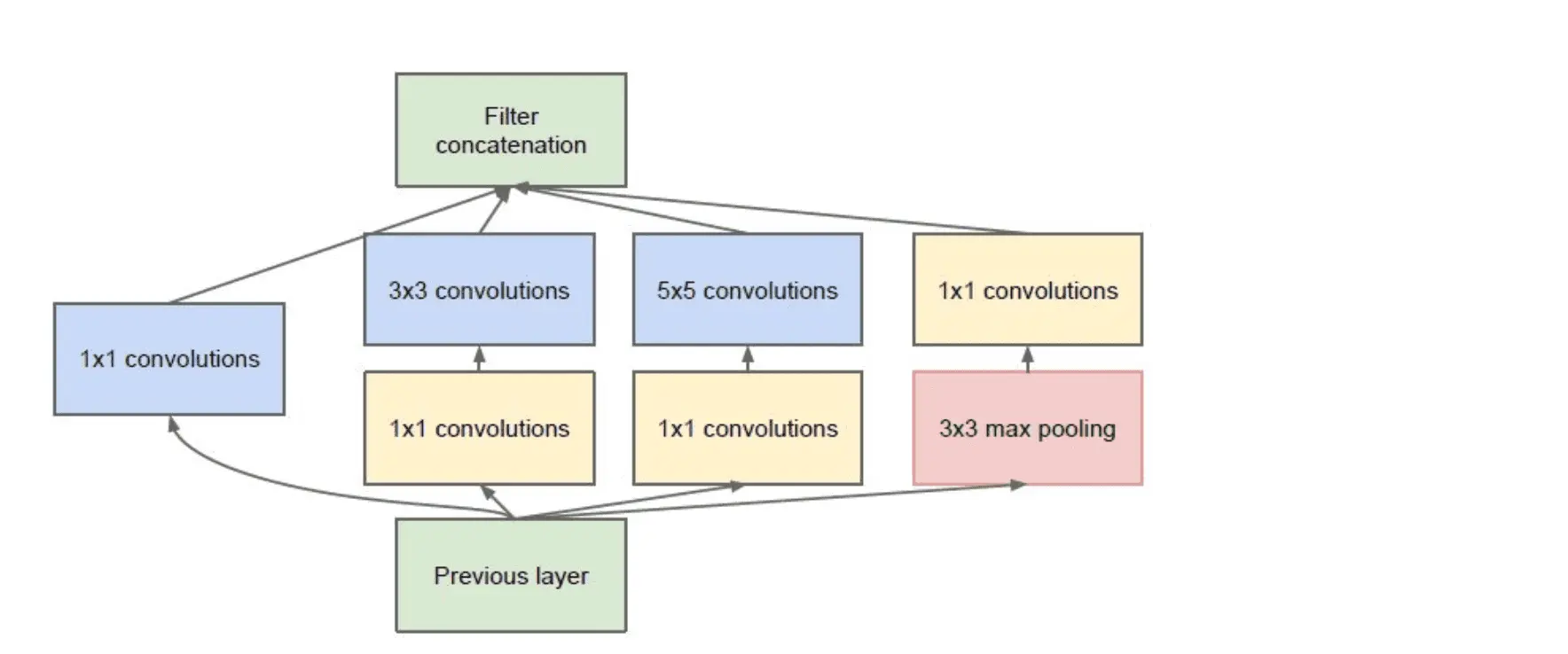 inception module分为并联的四路,分别为单独的1x1卷积,1x1并联3x3, 1x1并联5x5, 池化后1x1卷积。使用不同的卷积结构来提取不同特征,然后将他们组合在一起来输出。