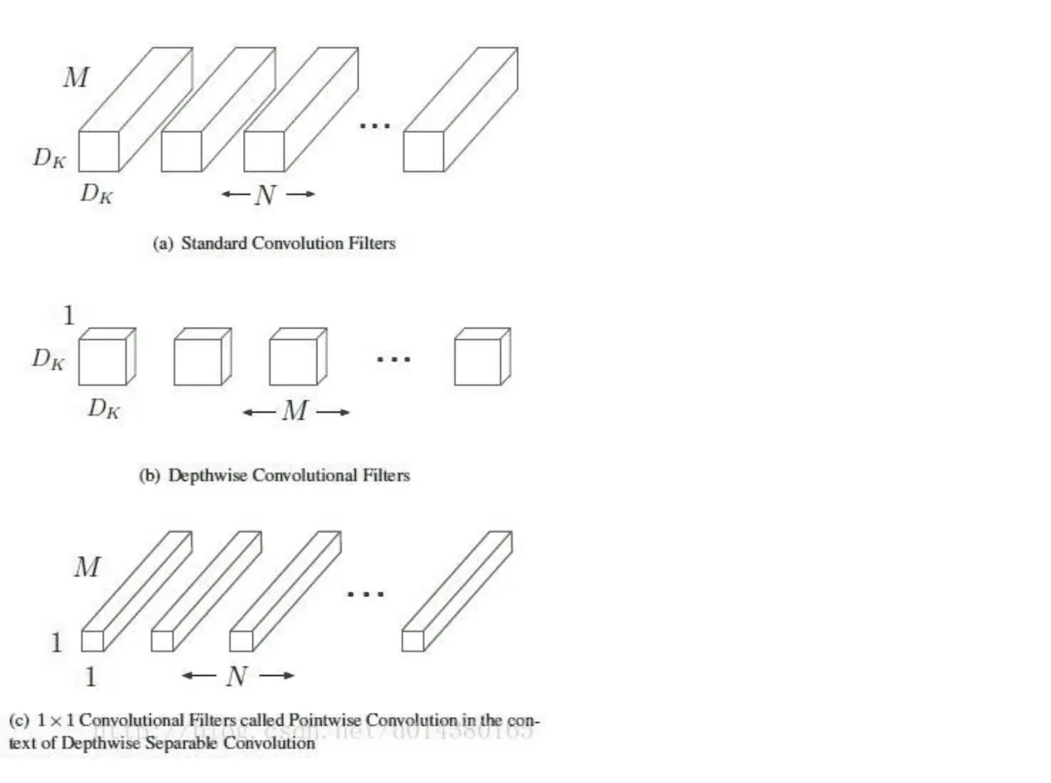 对于卷积核dk*dk,输入通道为M,输出通道为N的普通卷积,每个输出通道都是由M个卷积分别和输入通道做计算,然后累加出来,所以需要的参数量为dk x dk x M x N。而对于depthwise卷积,每个卷积只和输入通道的某一个通道发生计算,并且不需要累加操作,其卷积后的输出通道和输入通道相等,仍然为M。然后再经过一层1x1的普通卷积。故其参数为dk x dk x M + 1 x 1 x M x N。