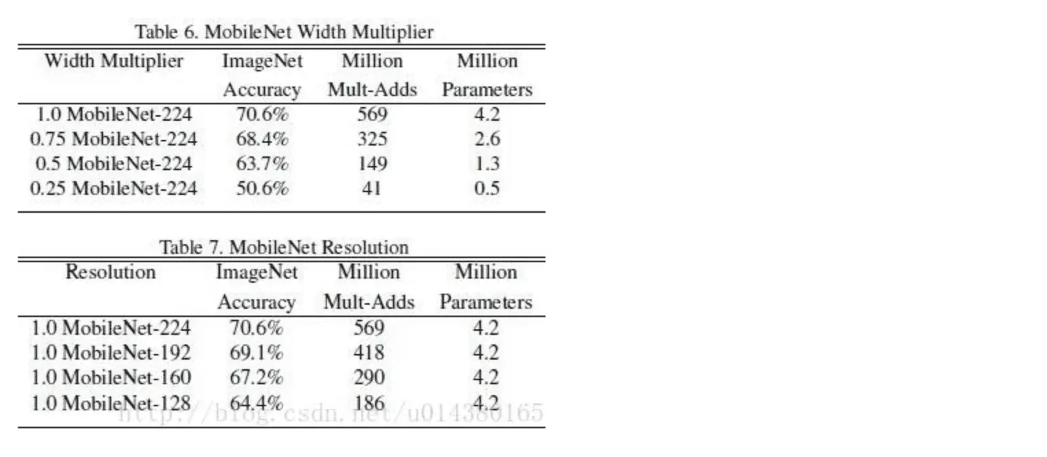 为了得到更小的模型,mobileNet还可以进行输入通道和分辨率的剪裁,称为Width Multiplier 和 Resolution Multiplier。Width Multiplier 表示输入通道变为baseline的多少倍, Resolution Multiplier表示输入图像缩小为多少。经过剪裁后的mobileNetV1_0.25_128模型,只有10M左右,准确率仍然可达到80%左右。作为端上图像预处理完全足够。下面是Width Multiplier 和 Resolution Multiplier的结果