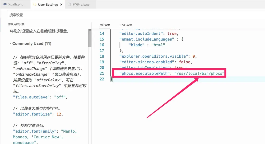 由于项目使用的是系统的 phpcs,所以需要在 user setting 中配置可执行路径和自己自定义的编写风格