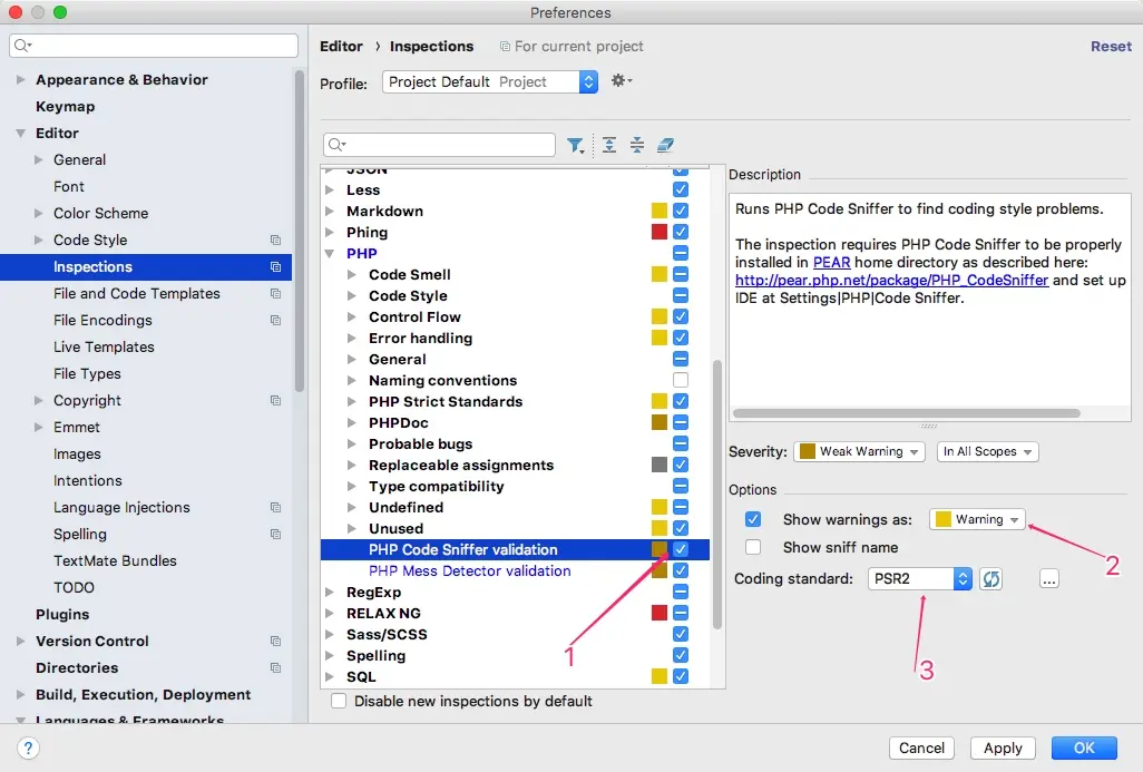 这里我本人推荐采用「全局安装」,可以在各个 IDE 上直接填入全局安装的 phpcs 可执行路径。但如果你的版本库是使用「git」的话,那我推荐使用「项目安装」,下文就知道原因了。